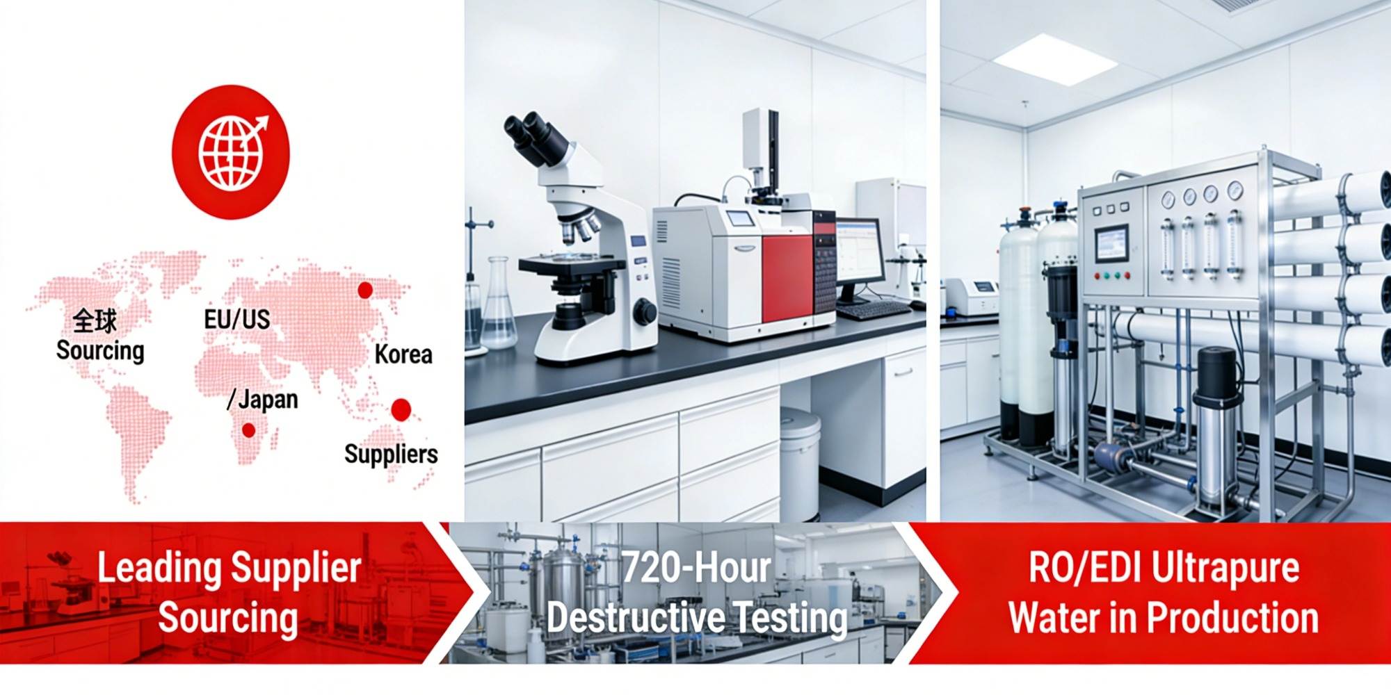 Grazie all'approvvigionamento globale da fornitori leader in UE/USA/Giappone/Corea, a laboratori interni che eseguono test distruttivi della durata di 720 ore e all'utilizzo di acqua ultrapura RO/EDI in tutta la produzione, garantiamo la qualità delle materie prime, la sicurezza del prodotto e la stabilità della formulazione.