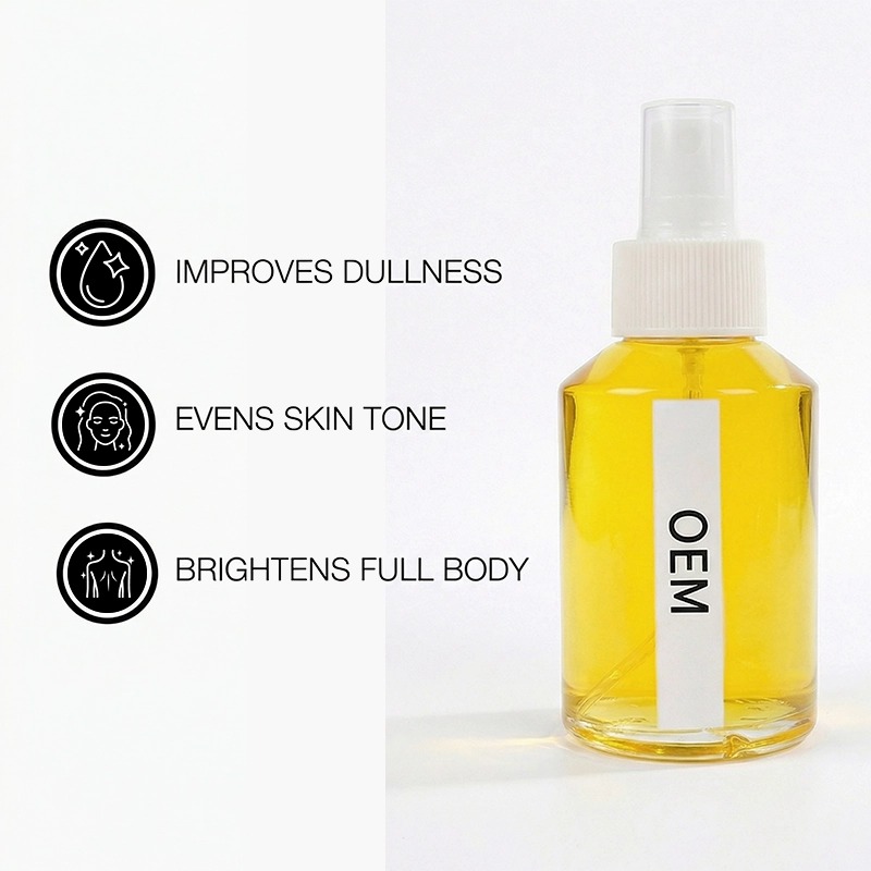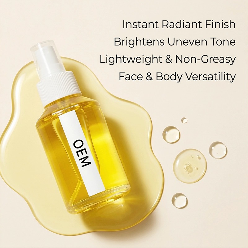 Un olio illuminante a rapido assorbimento che dona alla pelle spenta una luminosità naturale, uniformando l'incarnato nel tempo. Arricchito con niacinamide e derivati della vitamina C, è leggero, non unge e può essere utilizzato su viso e corpo. Prodotto con il supporto del nostro team di ricerca e sviluppo con dottorato di ricerca e in camera bianca GMPC. Quantità minima d'ordine ridotta, campioni rapidi. La tua formula, il tuo packaging.